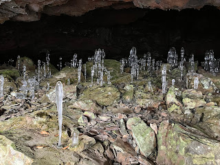 ついに辿り着いた洞窟の中には、ヒョロヒョロもやしっ子の氷筍が大勢並んでいました。塾長曰く、気温が低いと水滴が凍るのが早いため、細長い形になるとのこと。毎年異なる姿で迎えてくれる氷筍たちは、その冬の天候を敏感に受け取って表現してたんですね。